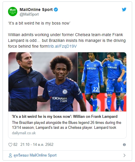 กล่าวว่าเขารู้สึกค่อนข้างแปลกเล็กน้อยที่ต้องลงเล่นให้กับ แฟรงค์ แลมพาร์ด ในฐานะลูกทีมจากเมื่อก่อนที่เคยเป็นเพื่อนร่วมทีมกันมา โดยทั้งคู่เคยลงสนามด้วยกันมาแล้ว 26 เกมเมื่อซีซัน 2013-2014 ซึ่งเป็นฤดูกาลสุดท้ายของ ซุปเปอร์แฟรงค์ ในถิ่น สแตมฟอร์ด บริดจ์ เขาเป็นผู้เล่นที่มีความเฉลียวฉลาดเป็นอย่างมาก ถือเป็นหนึ่งในนักเตะที่ดีที่สุดในตำแหน่งของเขาเลยทีเดียว ในเรื่องของคุณภาพของผู้เล่นนั้น เมื่อคุณได้เห็นนักเตะอย่างเขาแล้ว คุณสามารถมองเห็นภาพการเป็นผู้จัดการทีมของเขาในอนาคตได้เลย และเขาก็มาอยู่ที่นี่กับเราแล้ว มันเป็นเรื่องที่ค่อนข้างแปลกเล็กน้อยที่เขากลายมาเป็นเจ้านายของผม แต่ผมก็ดีใจเป็นอย่างมากที่ได้ทำงานกับเขาอีกครั้ง เขาทำให้ผมมีความมั่นใจในการเล่นและต้องการให้ผมมีความสุข ฟอร์มการเล่นส่วนหนึ่งของผมในช่วง 2-3 เกมที่ผ่านมานั้นต้องยกเครดิตให้เขาด้วย เขาพูดกับผมอยู่เสมอว่า ฉันอยากให้นายมีความสุข นั่นจึงเป็นเหตุผลที่ว่าทำไมผมจึงโชว์ฟอร์มได้อย่างที่เห็น วิลเลียน กล่าวกับเว็บไซต์อย่างเป็นทางการของสโมสร
